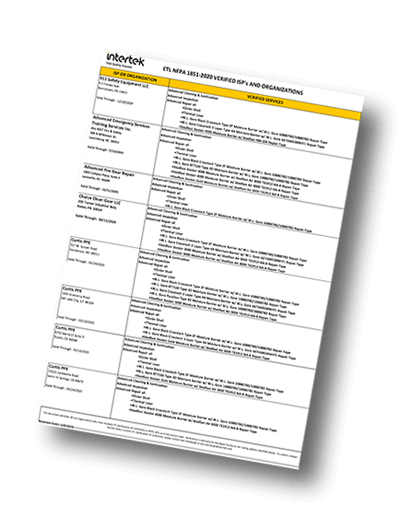Our industry-leading PPE testing services include verification of NFPA 1851 ISPs and Organizations, ensuring they can clean and repair Fire Fighter Gear in a manner that it still meets the minimum requirements of the certification standard. Verified ISPs and Organizations will be awarded the ETL Verified Mark, a symbol of performance integrity.